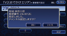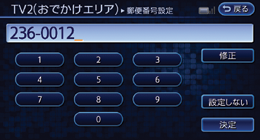 メニュー → 設定 → おでかけエリア、郵便番号設定(TV2)をタッチする