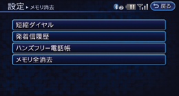 接続されている携帯電話の短縮ダイヤル、発着信履歴、ハンズフリー電話帳の登録内容をすべて消去します。