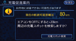 ルートが設定されていて、現在の航続可能距離では目的地または経由地に到達しない可能性がある場合、ナビ画面に充電を促す通知を表示するとともに音声で案内を行います。