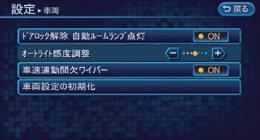 ナビ画面から車両の各機能を設定できます。各設定項目の詳細は、車両の取扱説明書をお読みください。