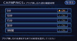 CARWINGS → CARWINGS設定 → 充電状態の通知 → プラグ挿し忘れ通知確認時間をタッチする