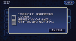 「MY-CAR」を検索し、画面に表示されているパスキー(Bluetooth®携帯電話を本機に登録するためのパスワード)を入力してください。