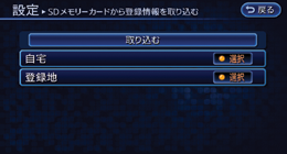 設定 → ナビゲーション → 登録地の編集・消去 → 登録情報の移し替え → SDメモリーカードから登録情報を取り込むをタッチする