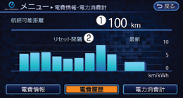 メニューボタン → 情報 → 車両情報 → 電費情報・電力消費計 → 電費履歴の手順でも電費履歴を表示できます。