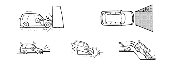 車両前方左右、約30度以内の方向から強い衝撃(上記と同等)を受けたとき。