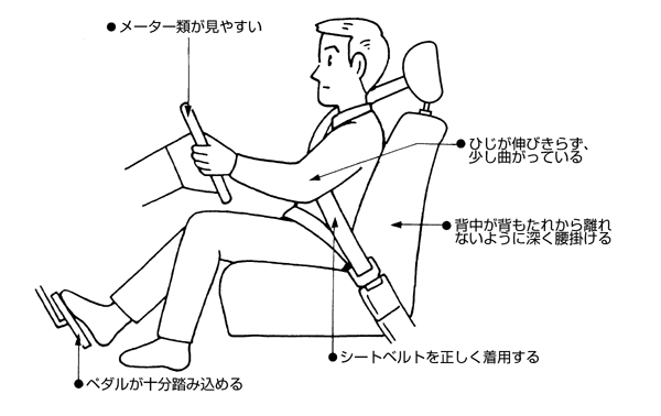 正しい運転姿勢がとれるよう、ハンドル、シート、ミラーを調節してください。