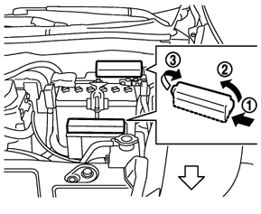 タブ(1)を押してヒューズ/ヒュージブルリンクホルダーカバーを(2)の方向(右側)から持ち上げ、次に(3)を持ち上げて取り外します。