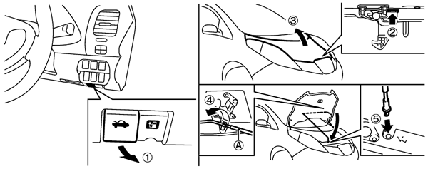 運転席右下にあるフードオープナー(1)を引きます。フードの先端が少し浮き上がります。