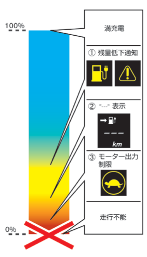 これらの警告が表示されたときは、ナビゲーション画面の案内に従い、すみやかに最寄りの充電施設で充電してください。なお、ナビゲーションシステムで表示される到達可能範囲内に充電施設が表示されないときは、安全な場所に停車して、日産EVカスタマーセンターにご連絡ください。