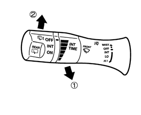 パワースイッチを押して電源ポジションをOFFにしてから1分以内に、ワイパースイッチを手前に引きます。ワイパーの作動が途中で止まり、ワイパーアームを引き起こすことができます。