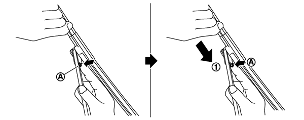 解除タブ(A)を押しながらワイパーブレードをワイパーアームから(1)の向き(下向き)に動かし、取り外します。