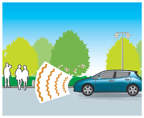 車両接近通報装置(VSPシステム)は、低速走行中に車両が接近していることを車両接近通報音で歩行者に知らせます。