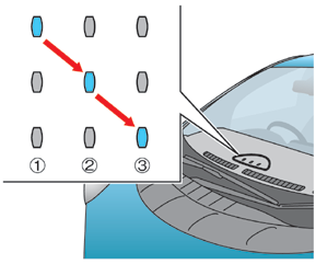 タイマー充電が予約されているときに電源ポジションをOFFにしてから充電ケーブル(EVSE)を接続すると、充電インジケーターは(1)から(3)の順に点灯します。充電ケーブル(EVSE)を接続してから約15分後に自動的に消灯します。