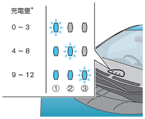 *:ここでの充電量は、メーターにあるリチウムイオンバッテリー残量計の点灯している数を表しています。