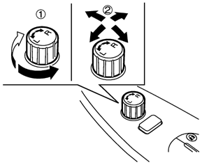 スイッチ(1)を右又は左へ回して右側又は左側ドアミラーを選択し、スイッチ(2)を動かして後方が十分確認できる位置にミラーの角度を調節します。