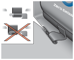 充電ケーブル(EVSE)のケース下側についているベルトは、ラゲッジボード下のフックに確実に通してください。フックにベルトが確実に通されていないと、事故などでケースが飛び出すおそれがあります。