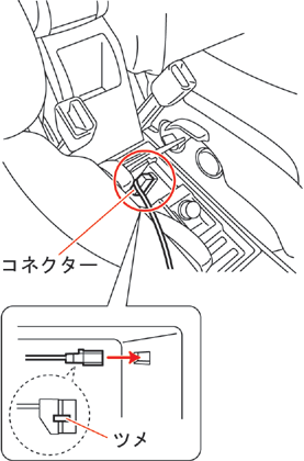 センターコンソール内にあります。コンソールボックスを開けて、接続端子のカバーを開けます。