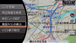 地図上にガソリンスタンド、コンビニ、駐車場などの施設アイコンを表示できます。