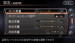 ガイド音量、電話着信音量、電話受話音量、カーウイングス読み上げ音量は、その音が出ているときにVOLスイッチで調整することができます。調整時は、画面下部に調整する音量の種類がアイコンで表示され、現在の音量がバーグラフで表示されます。
