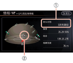 GPS 情報の測位(受信)状態、緯度、経度、概算高度、衛星配置を見ることができます。