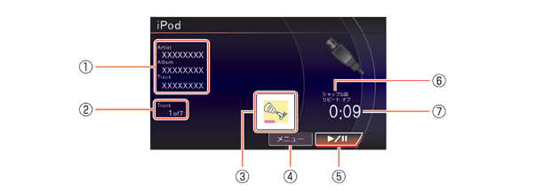 曲情報が登録されているときは、アーティスト名/アルバム名/曲名を表示します。また、Podcast再生中はアーティスト名の代わりにリリース日を表示します。