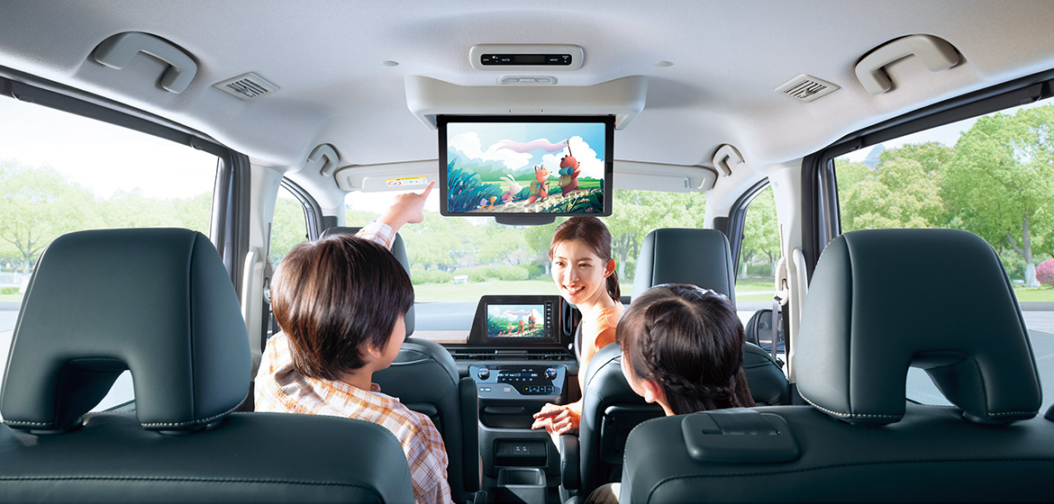 後席でTVや動画コンテンツを楽しめる後席専用モニターは、ドライブをより快適にする人気オプション。前席でナビゲーション画面を表示しながら、後席ではさまざまな映像を楽しめるので、移動時間が特別なひとときに変わります。