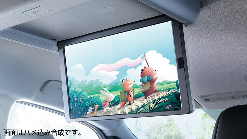 後席で迫力たっぷりの大画面を楽しめるリヤシートエンターテインメント。ルーフに装着して、インテリアによくなじむオリジナリティあふれるデザイン。