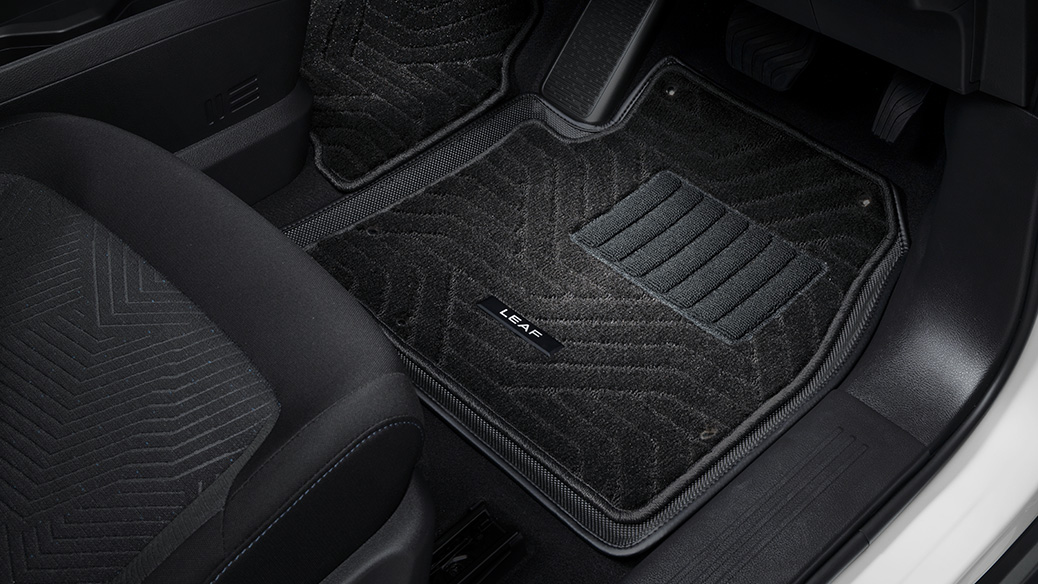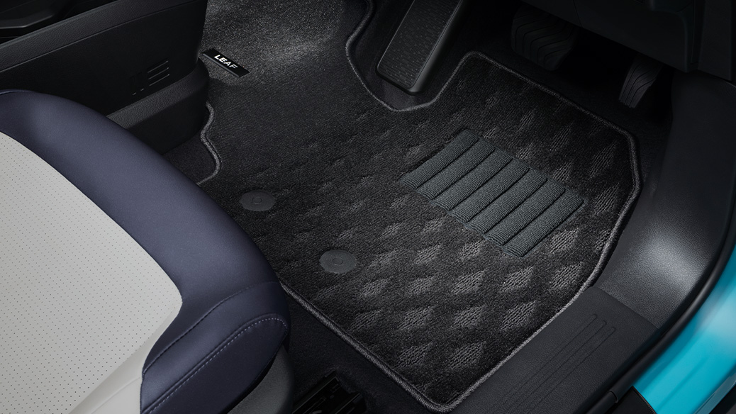 広くフラットな前席フロアに合わせて一枚ものとし、足元の雰囲気をよりラグジュアリーに見せます。