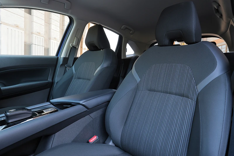 外に向かって広がるようなインパネに、センターディスプレイと一体化した液晶メーターを装備。電動化にふさわしい先進感と使いやすさを兼ね備え、上質な素材を使用したシートを含めて、所有欲を満たすインテリアデザインに仕上がっている