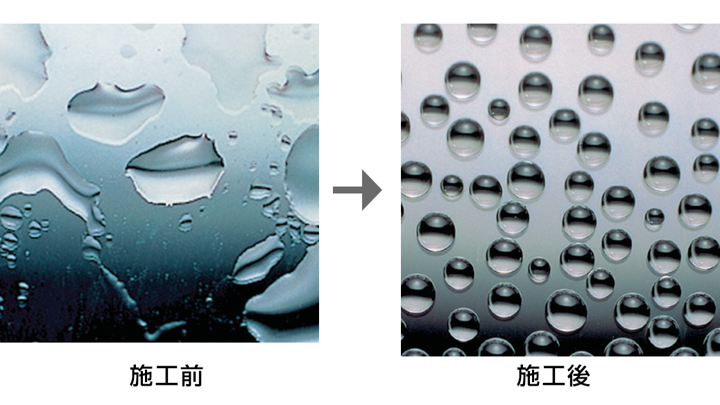 処理した後は雨粒が水玉となってはじけ飛び、良好な視界を確保できます。