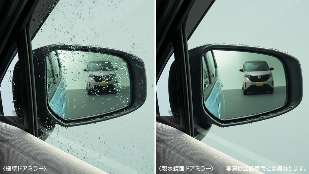 ミラー面に雨滴をなじませ、雨天時の後方視界を確保します。