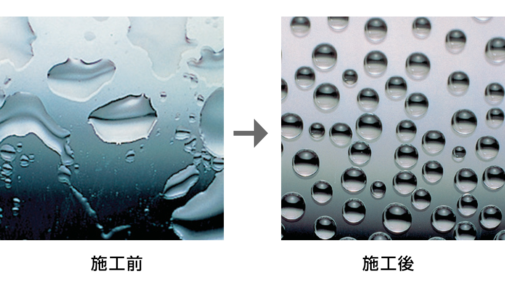 処理した後は雨粒が水玉となってはじけ飛び、良好な視界を確保できます。