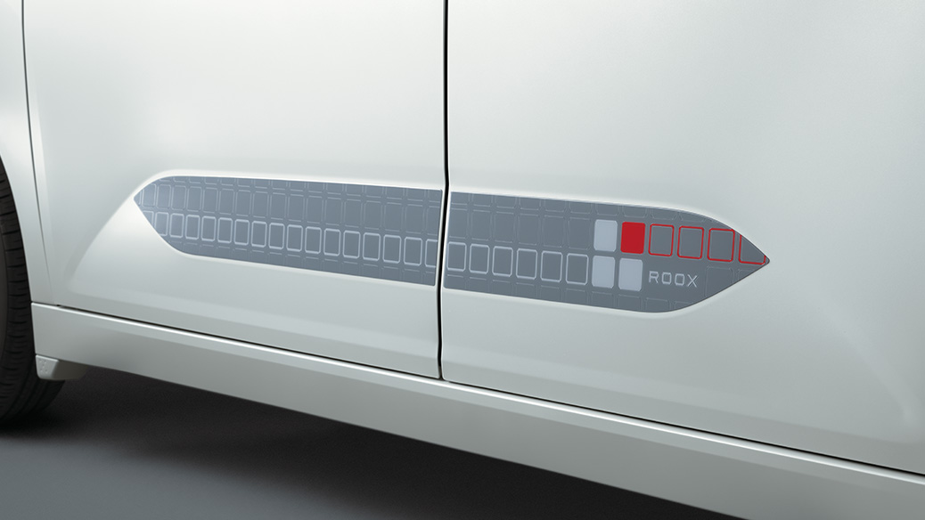 バックドアの“ROOX”ロゴの凹面に合わせて貼り付ける立体成形の“ROOX”ロゴです。