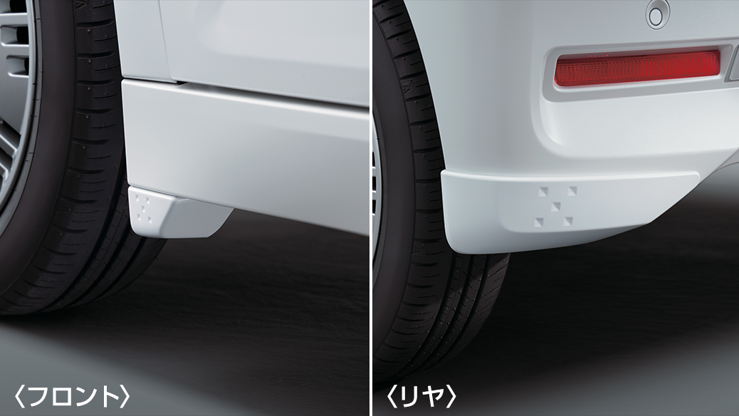 注)マッドガード非装着車に対して、最大フロント約50mm、リヤ約41mmダウンします。本商品を装着した場合、縁石や段差の大きな場所では路面等と干渉する場合がありますのでご注意ください。各色につきましては、カーライフアドバイザーにお問い合わせください。