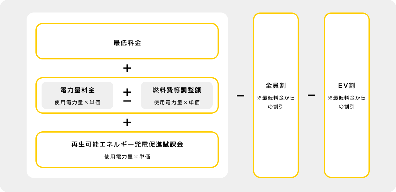 最低料金・基本料金と電力量料金はこちら(PDF) 燃料費等調整額等はこちら 再生可能エネルギー発電促進賦課金はこちら 割引と特典はこちら